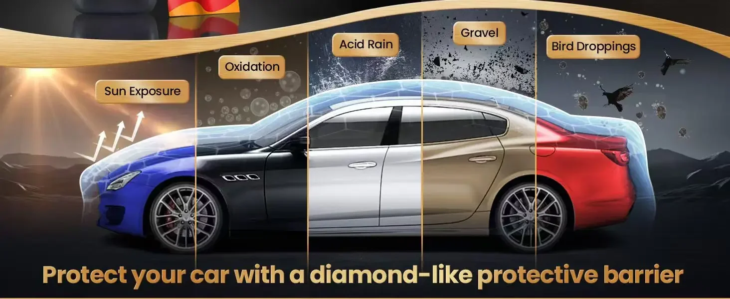 20H HARDNESS: Our graphene ceramic coating contains genuine german-imported nano graphene molecules, Offering 20H hardness, creates a diamond-like barrier that guards against scratches, cracks, and other forms of damage, preserving your vehicle's beauty