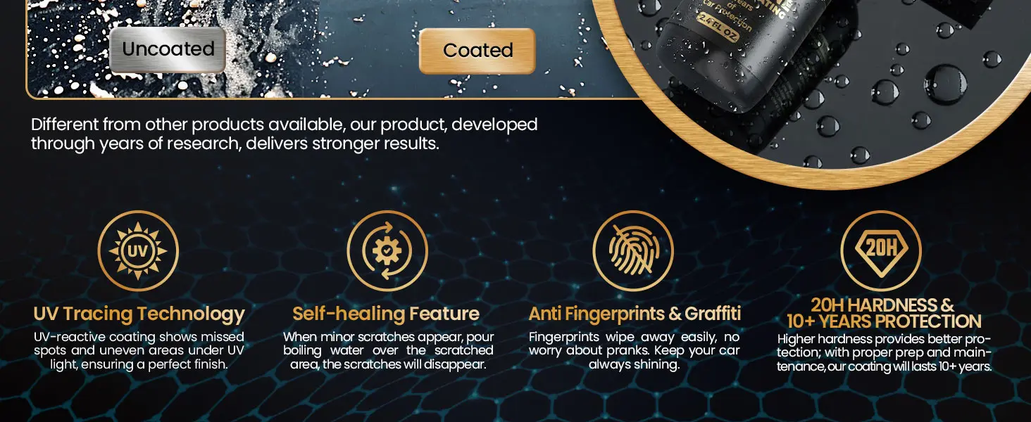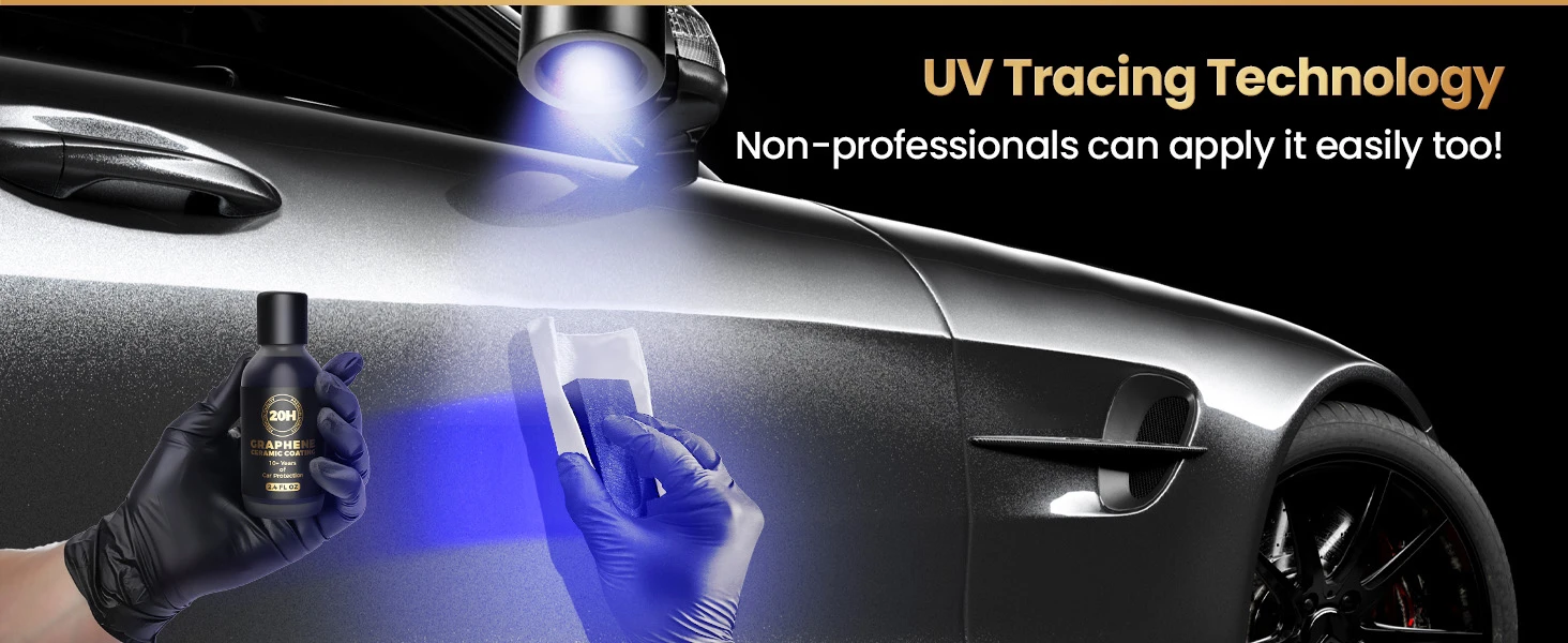 UV TRACING TECHNOLOGY: Our graphene coating is visible under UV light, it allows you to see where the coating has been applied, no worries about uneven coverage or missed spots. Applying a graphene ceramic coating for cars has never been easier