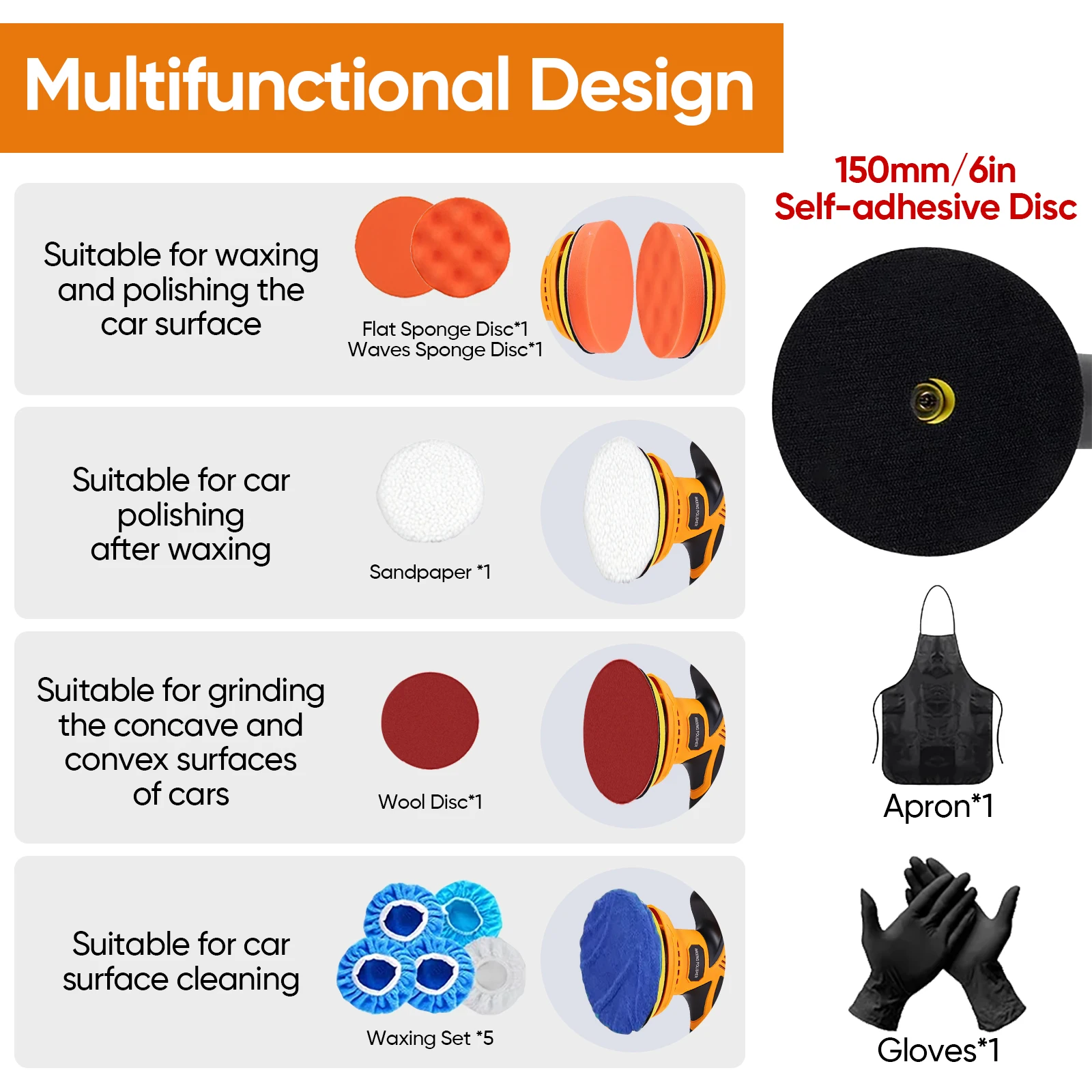 Packaging accessories: 1* polishing machine, 1* flat pad, 1* wavy pad, 1* wool pad, 1* sandpaper, 5* pad covers, 1* apron, 1* polishing gloves, 1* charger, 2* battery