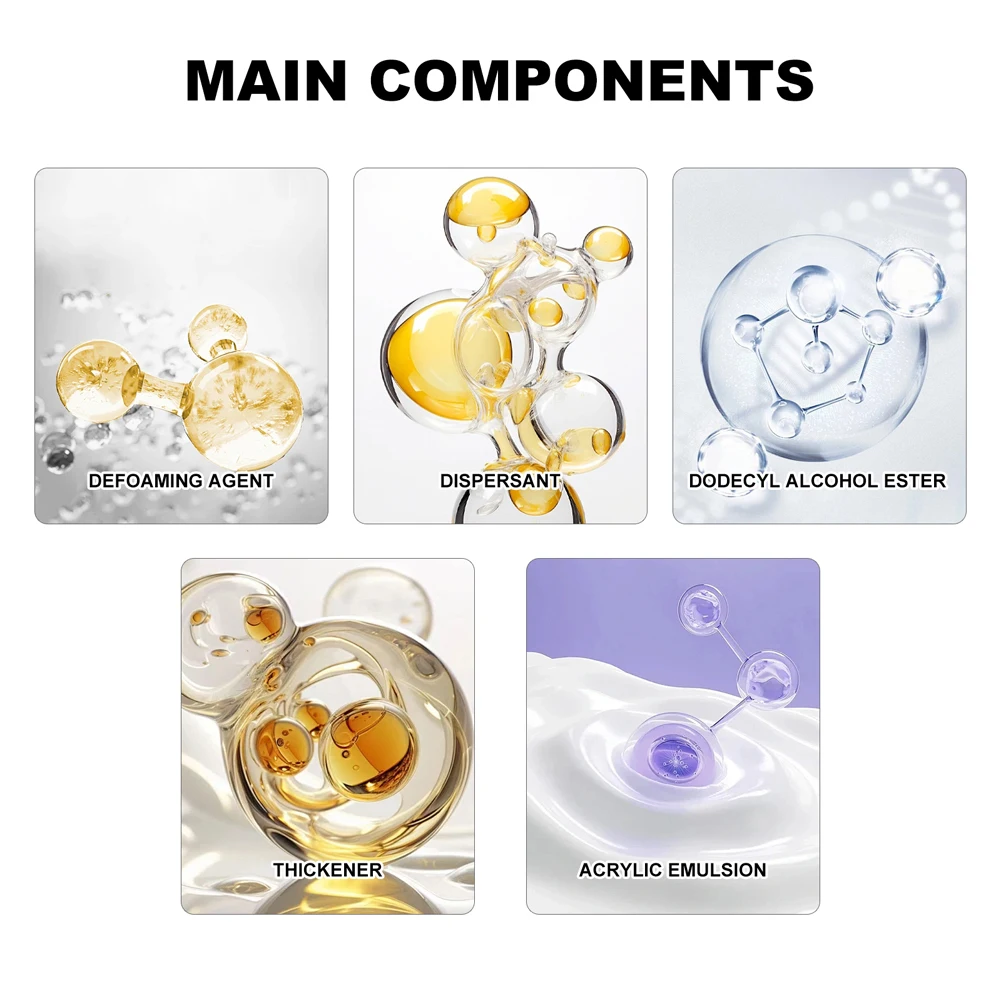 Material: defoamer, dispersant, dodecyl alcohol ester (film-forming aid), thickener, acrylic emulsion