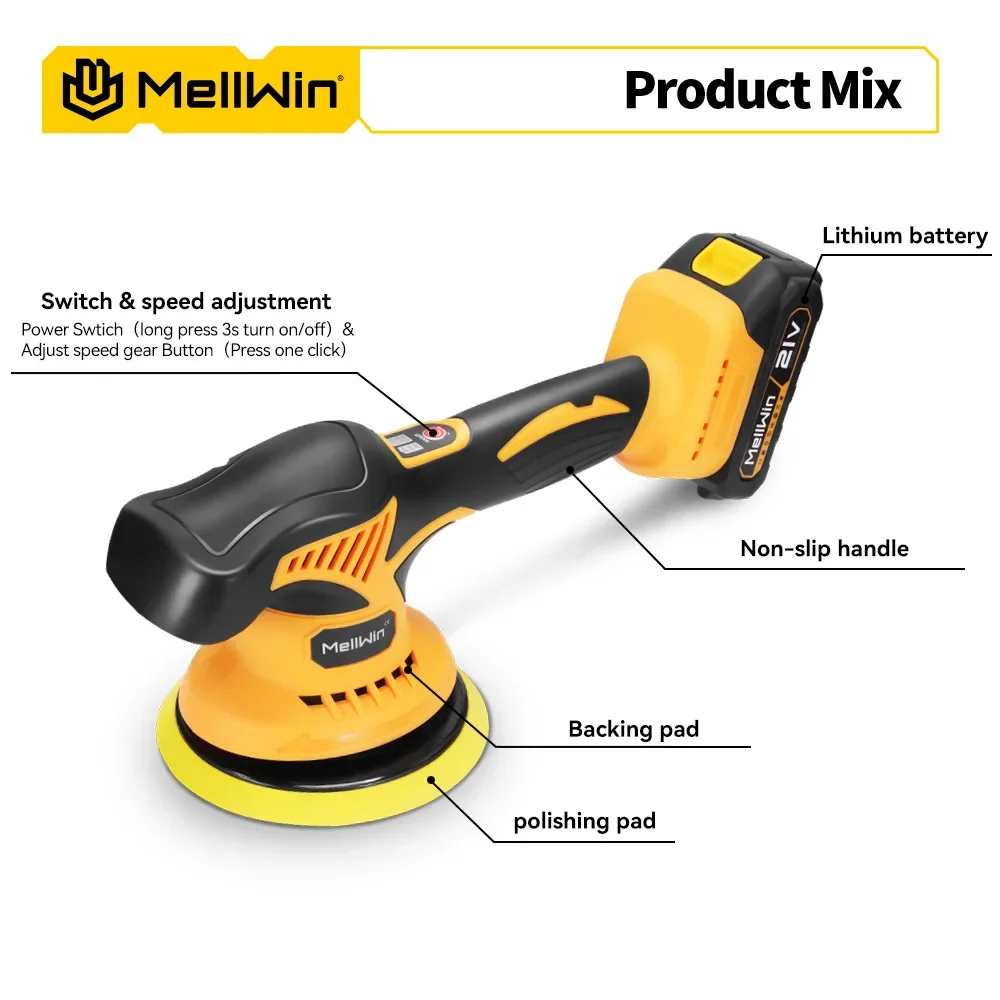 MELLWIN 150mm 6000rpm Cordless Electric Car Polisher 8 Gear Adjustment Car Polishing Auto Waxing Rotary Tool Fit For 21V 18V-21V Battery Pins
