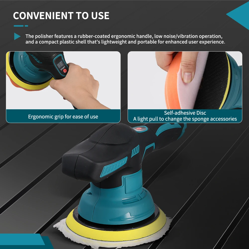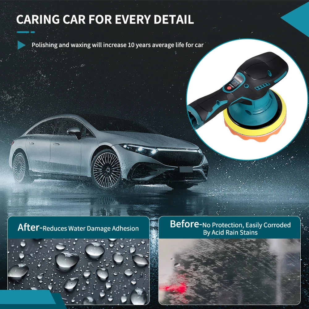 machine, the speed is 2500-5000RPM, you can easily adjust it to your needs. The polisher can be used as a wax, works smoothly and evenly without damaging the car paint, and makes the car like new again.
