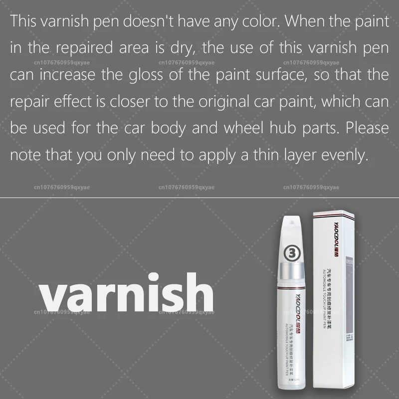 This varnish pen doesn't have any color. When the paintin the repaired area is dry, the use of this varnish pencan increase the gloss of the paint surface, so that therepair effect is closer to the original car paint, which canbe used for the car body and wheel hub parts. Pleasenote that you only need to apply a thin layer evenly