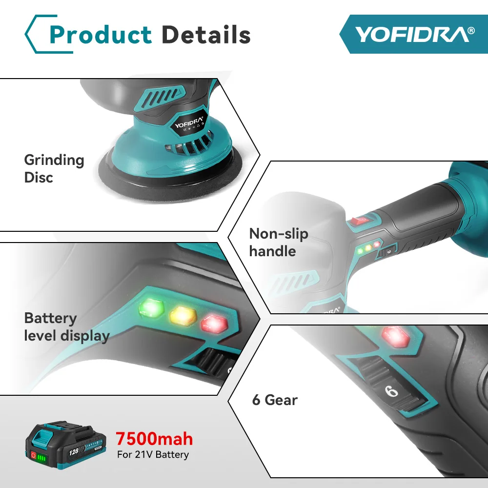 YOFIDRA 150MM 7000RPM Electric Car Polisher 6 Gears Cordless Auto Polishing Sanding Wax Power Tool For Makita 18V Battery Pin